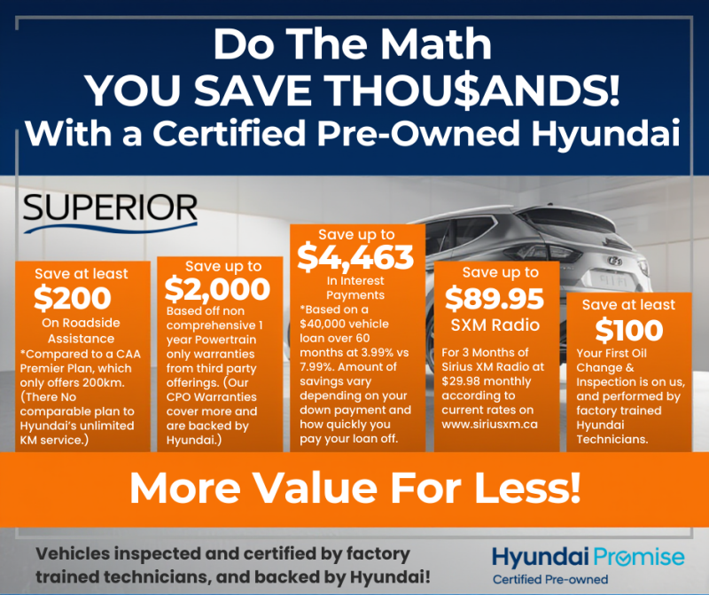 All Hyundai Promise Certified Pre-Owned vehicles also come with 365 days of 24-hour Roadside Assistance so if you need us, we will be there for you.